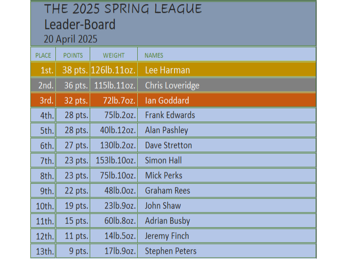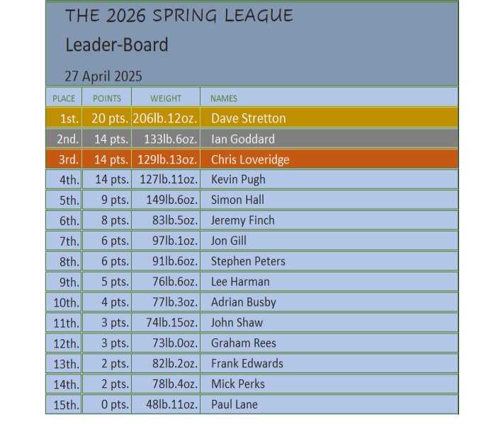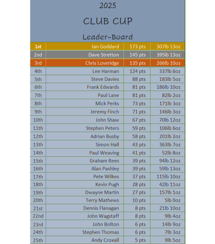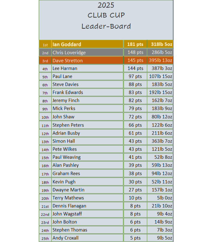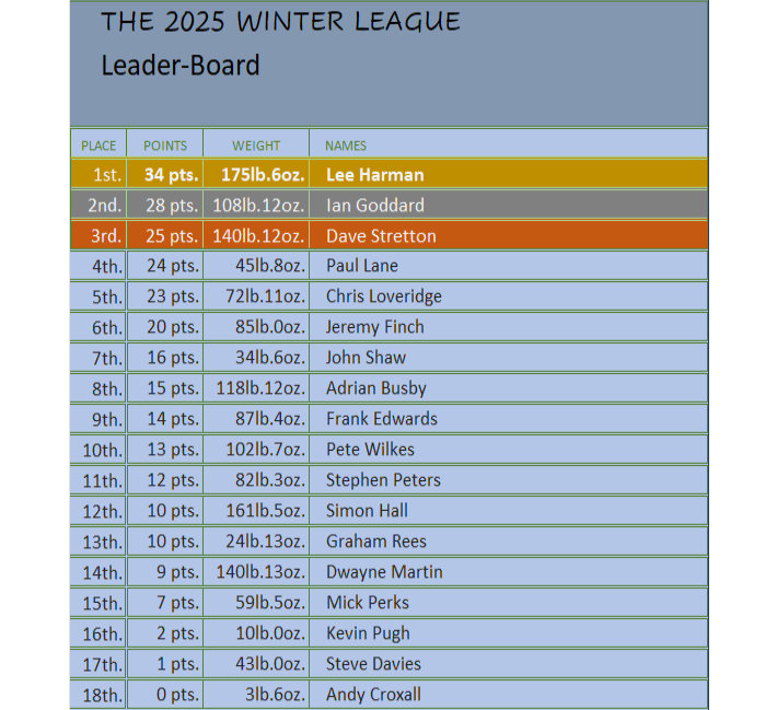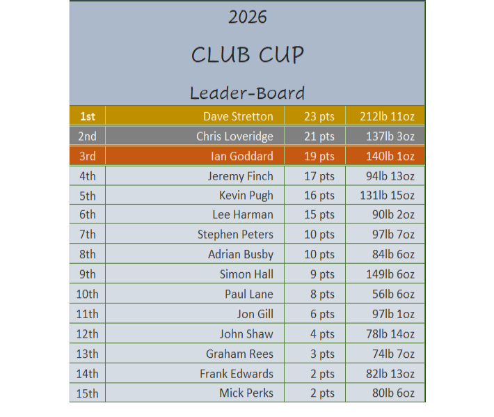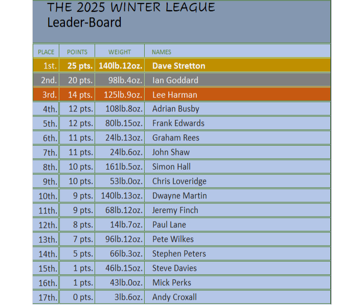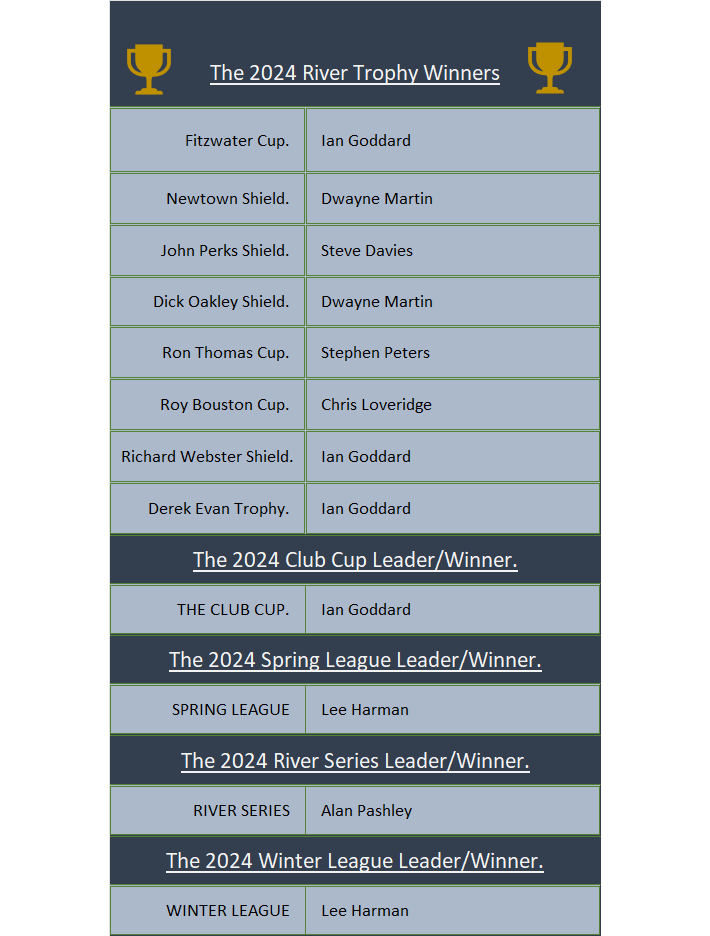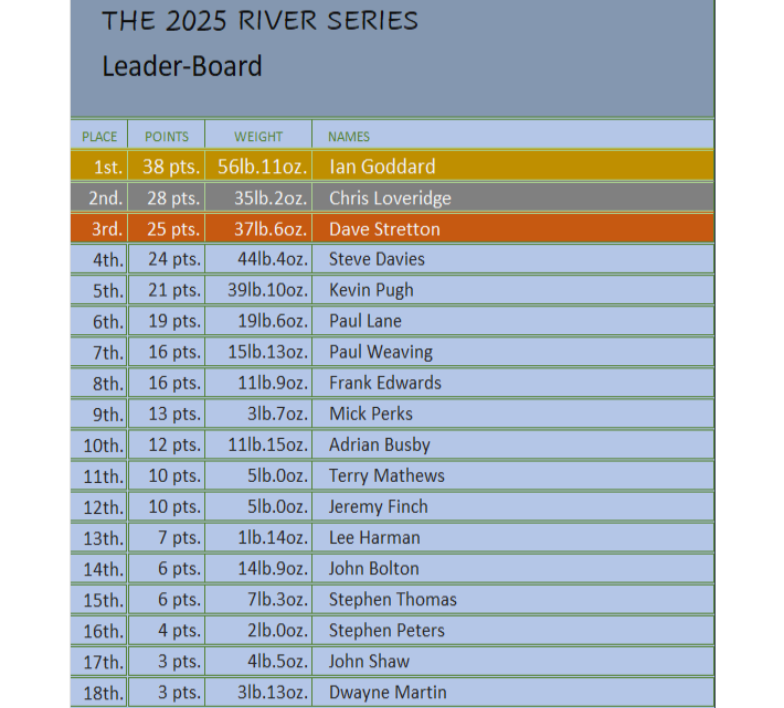 After the 5th contest in the river series for the 2025/26 season and the winner 0f this season River Series is Ian Goddard with 38 pts. In second place is Chris Loveridge with 28pts with Dave Stretton in 3rd place with 25pts.